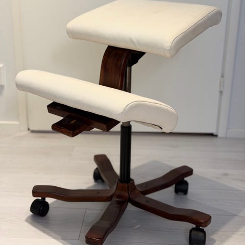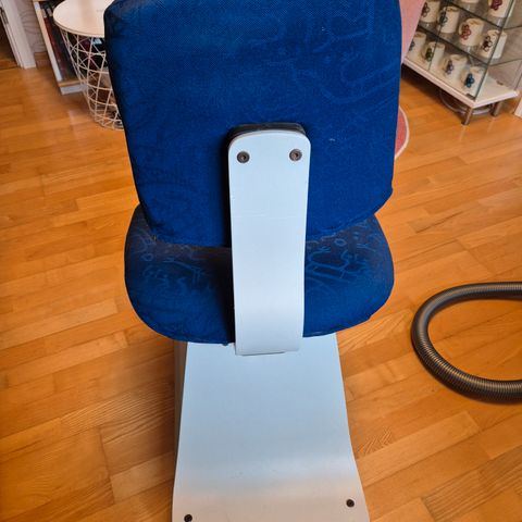 Here is a wonderful, original Stokke Varier kneeling chair with backrest that is finished in blue fabric.
