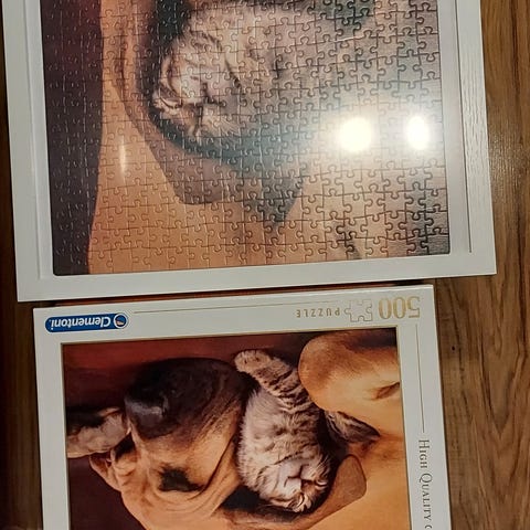 Hyväkuntoinen palapeli, purettuna omassa laatikossaan.