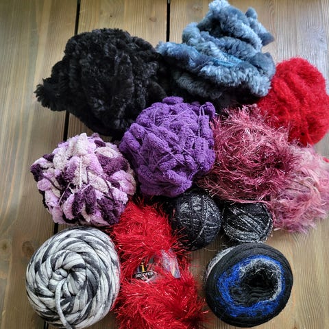 Erilaisia efetktilankoja, paljetti, kimalle jne, yhteensä 800 g, ei tupakoitu tai eläimiä, hinta kaikki 800 g 12