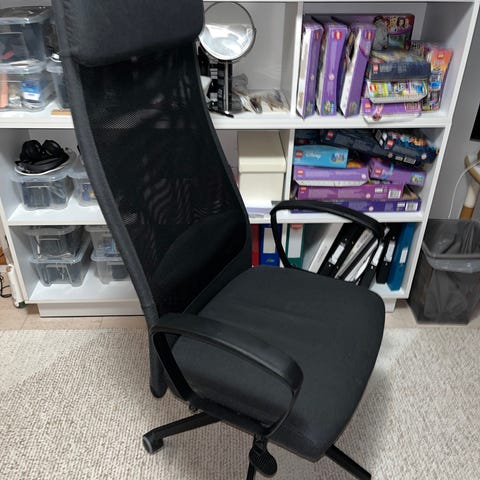 Turkoosi, metallinen pyörillä varustettu työtuoli. Tukeva ja mukava istua. Kissatalous, vain nouto. Istuinkorkeus säädettävissä. Vain nouto.