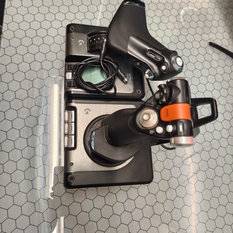 Kuvien siistikuntoinen ja lähes uudenveroinen Logitech X52 Professional H.O.T.A.S. -ohjainsetti. Ollut todella vähällä käytöllä. Throttlen näytössä on vielä suojakalvo päällä. Soveltuu erinomaisesti lentosimulaatioihin ja avaruuspeleihin (esim. Microsoft Flight Simulator, Elite Dangerous, Star Citizen). Kauppaan kuuluu Logitech X52 Professional joystick, Logitech X52 Professional throttle ja USB-liitäntäkaapeli.