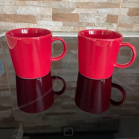 Iittalan punaiset Teema-mukit, kahdessa i-tarra. Ei käytön jälkiä. Yhteensä 50 euroa.