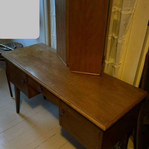 Nopea haku etusijalla! 50-60 luvun tyylinen kampauspöytä yksinkertaisella ja funktionaalisella muotoilulla. Säilytetty sisällä, mutta maalipinta on kohonnut. Avaimia on ainoastaan yksi tallessa. Mitat noin mittoja. Peilin korkeus tasosta n 57cm. Myynnissä myös muualla.