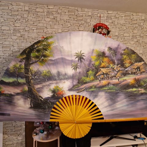 Uudenveroinen Annon musta-valkoinen punottu viuhka seinäkoriste. Korkeus 55 cm
