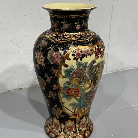 Myydään kaunis japanilainen satsuma-tyylinen vaasi (mid-1900-luku). K 31 cm, L 20 cm, kanta halk.11,5 cm. Käsinmaalatut sekä kullatut hienot yksityiskohdat.