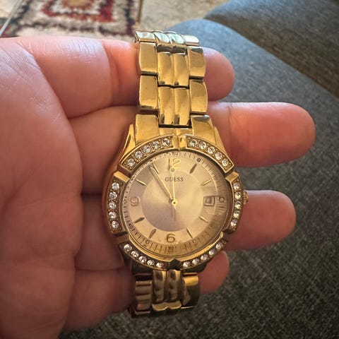 In English: Finish off your look with this glittering accessory. The Guess rose gold watch features stunning crystal detailing. The watch has a stainless steel case and a genuine leather strap. The watch is an analogue quartz watch and is water resistant. The battery needs to be replaced. Dimensions: 3.6 x 3.6 x 1 cm. Dimensions of the strap: 1.6 x 22.5 cm Weight: 150g Payment: bank transfer, mobilepay, pivo, cash Pick-up: Vuorentausta, Ylöjärvi, Finland. Interested? Send me a message by pressing the: Lähetä Viesti - button. Possibility of international shipping as well. Avainsanat: rannekello / kello / Guess / ruusukulta / joululahja /watch / wristwatch / rosegold