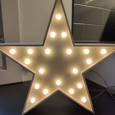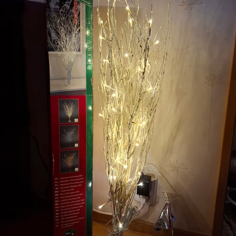 Myydään valkoinen risukoriste valoilla. Koristeen korkeus 35cm ja halkaisija 25cm. Pitkä valkoinen johto muuntajalla. Koriste kulkeutuu välille Halkia - Helsinki ja Halkia - Porvoo.