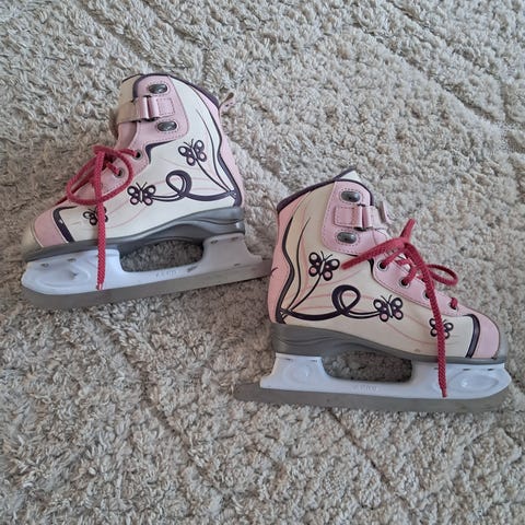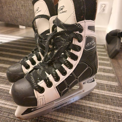 Bauerin koon 33.5 luistmet. Sisämitta raksamitalla 21,5cm. Jo useammalla olleet, mutta vielä hyvin toimivat. Toisessa luistimessa sisällä pieni kuluma vuoreessa, muuten siistit sisältä.