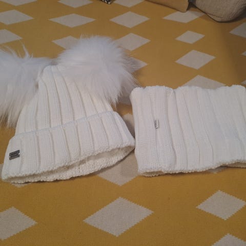 Myydään kuvien kaksi valkeaa pipoa ja kaulahuivit. Hinta 5 euroa/ tuote. Haku ja maksu pp Oulusta.