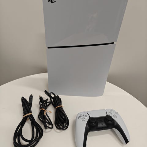 Ps5 slim levyllinen versio, 2 ohjainta, 2 ohjaimen laturia ja 1 peli