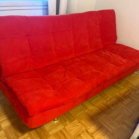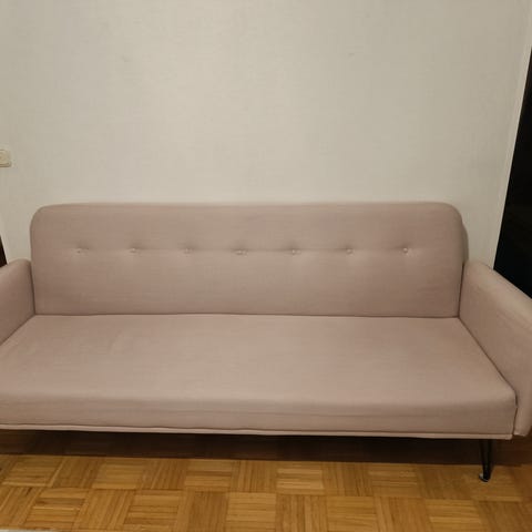 Puinen levitettävä lyhytnukkainen plyysisohva. Siisti ja hyvä istua. Petarin kanssa hyvä varavuode yhdelle. Pituus 194, nukkumapituus 180. Syvyys levitettynä 104, syvyys koko sohva 75. Selkänojan korkeus 75. Kaikki mitat cm. Löytyy myös yksi nojatuoli samaa sarjaa, katso kuva. Sen saa myös mukaan jos haluaa. Nouto Enosta.