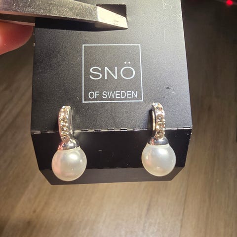 Snö of sweden merkkinen kaulakoru ja korvakorut, joiden helmi helmiäisen beige. Kalaukorun hopeisessa osassa näkyy vähän reunoissa kulumaa mutta yleisilme on siisti. Helmen väri näkyy parhaiten viimeisessä kuvassa.