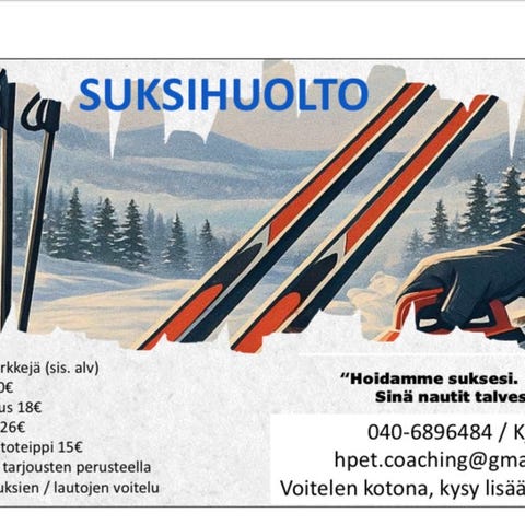 Teen omien välineiden huollon ohessa myös muille suksihuoltoa. Noutopalvelu onnistuu myös.