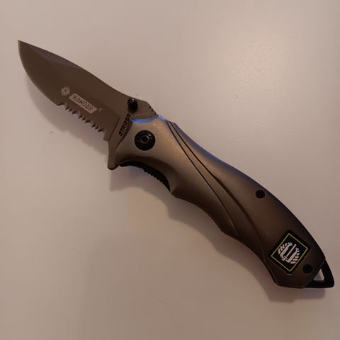 Uulkomailta ostettu rosteri kääntöveitsi. Kulkenut taskussa, edelleen tehdas terässä. Katkottu naruja ja avattu paketteja tms. Ei tule heti vastaan samalaista.