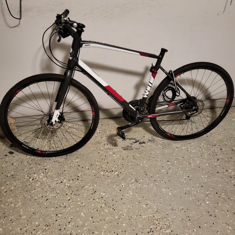 28" Ghost hardtail hybrid bike. The rear shifter is upgraded with Shimano Deore. Disk brakes.
