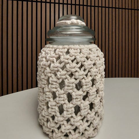 Teen makramee käsitöitä mm. tällaisia kynttilälyhtyjä, joissa voi polttaa tuikkua tai pitää säilytyspurkkina. Lasipurkki kierrätetty, sisältää kullan värisen kierrettävän kannen. Korkeus 12,5cm ja ympärysmitta n. 10cm. Makramee osuus on irroitettavissa helposti, jotta purkin pääsee pesee esim. astianpesukoneessa.