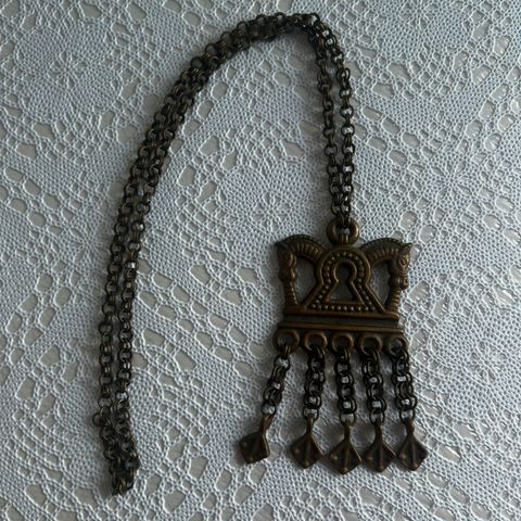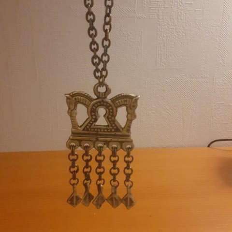 Riipuksen leveys 47 mm, korkeus 90 mm. Ankkuriketju 70 cm, ei lukkoa. Hopeoitu.