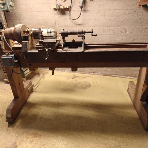 Otsikon mukainen vaha puinen puusorvi kaipaa uutta sorvaria. Sorviin on jokunen vuosi sitten uusittu sähköt. Sorvi painaa ihan kiitettävästi, mutta kyytiin nostossa avitetaan.