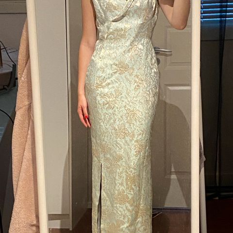 Silkkinen vintage iltapuku 80-luvun lopulta. Koko on 40, mutta vastaa ehkä nykyistä 38:a. Puvussa on spagettiolkaimet, mutta voi pitää ilmankin, koska yläosassa on ”luut”, jotka pitävät puvun paikoillaan. Käyttö on ollut vähäistä. Pitkän säilytyksen takia kaipaa varmasti pesetystä.