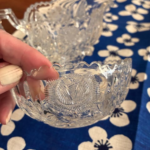 Lysterilasinen kermakko ja sokerikko, joissa koristeellinen aaltoileva muotoilu. Sarja sisältää yhden kermakon kahvalla ja yhden sokerikon ilman kantta. Molemmat esineet ovat läpikuultavaa lysterilasia. Tämä setti sopii erinomaisesti sekä arki- että juhlakattauksiin. Sokerikon halk 9,5 cm, kork 4,5 cm. Kermakon halk 8 cm, kork 5,5 cm,