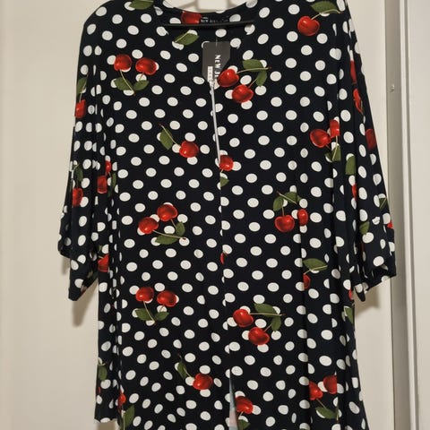 Harmaa hupullinen tunika. Edessä helmassa ja hihansuissa mustat/turkoosit printit. Nyöritystä edessä. Epäsymmetrinen helma. Koko 4xl. Olka-helma n. 100. Nauhojen ollessa kuten kuvassa, kainalo-kainalo n. 59, joustaa n. 20cm. Nauhoilla pystyy tiukentamaan. Uudenveroinen. 7e + pakettilähetys 7,90e. Myynnissä myös muualla.