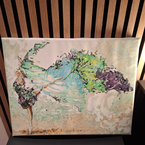 Taulu ostettu Viipurista taidekaupasta. Koko on 40 x 30 cm. Kehykset ovat Suomesta. Teoksessa kirjaimet V.T. Tummalle pohjalle Ballerina. Nouto.
