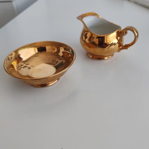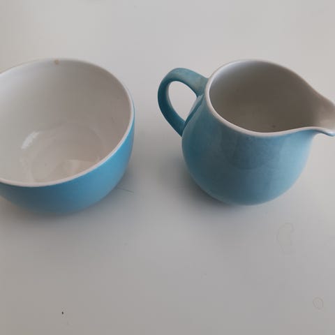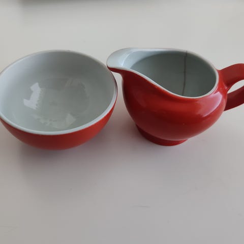 Arabian vanha keltainen sokerikko ja kermakko. Sokerikossa särö, mutta ei haittaa käyttöä. Hinta yhteensä 10 euroa.
