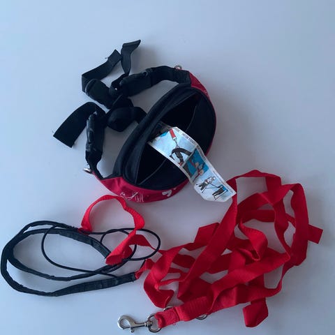 Alunperin Nordic Cab Active -peräkärryyn hankitut valjaat ja aisa hiihto- tai vaellus/kävelyretkille, hankittu 2021.