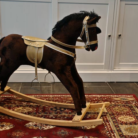 Puinen keinuhevonen lapsille ja aikuisille! Hevonen on ruskea, jalakset ja runko punaiset. Harja ja häntä ovat aitoa harjasta, satula on kauniisti niitattu ja verhoiltu kankaalla. Keinuhevonen on iso ja tukeva kovaankin laukkaan. Rakenne on massiivipuuta.Ratsastus onnistuu jopa kaksi päällä(pieni ja iso).