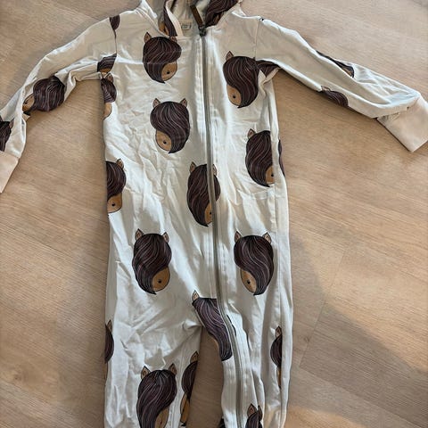 Ihana pehmeä ja lämmin hupullinen ja taskullinen jumpsuit / onesie / onepiece / olohaalari / lämpöhaalari, koko 98/104 (nyt 110 käyttävälle resorit jää liian lyhyiksi, parempi isompana kuin liian pienenä, koska on resorit hihansuissa ja lahkeissa). Merkki Ellos. Väri ruskea-musta-valkoinen-tummanharmaa.