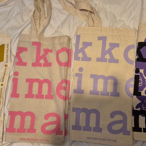 Keräiletkö tai keräileekö ystäväsi Marimekkoa? Itsellä jo hyvä kokoelma ja nyt joutaisi tuplat pois, joten: Nyt vaikka lahjaksi tai itselle. Uusia Marimekko kasseja. Kpl hinta 25€. Osaa väreistä on useampi kappale. Haku Iisalmi Marjahaka. Kulkeutuu ilmaiseksi Iisalmi-Kuopio ja Iisalmen keskustan läheisyydessä voin tuoda kotiin saakka. Myös postitus onnistuu XS kirjeenä, jolloin tulee seuranta tunnuksella ja kotipostilaatikkoon saakka. Voin muuttaa tarvittaessa toridiiliksi, mikäli ostaja niin haluaa. MM Marimekko kangas kassi keräily juhla kassi unikko Marimekko tekstikassi laukku. Liukuvärjätty pinkki vaaleansininen punainen keltainen kulta teksti