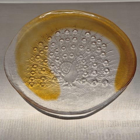 Humppilan lasin Riikinkukko tarjoilulautanen. Halkaisija 26cm leveimmästä kohtaa.