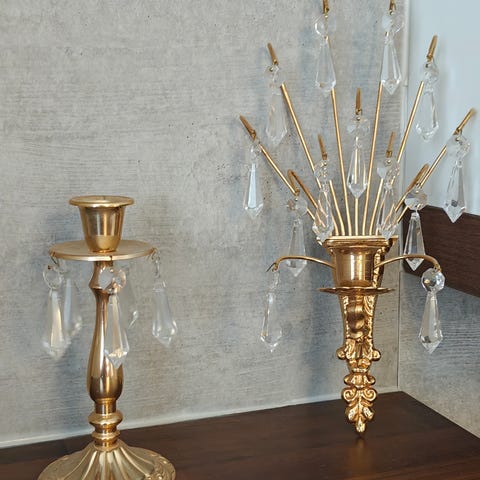 Irrotettavat pikku maljakot keskellä. Toisen jalan juuressa ruostetta. Jalustat jotain kiveen. Tollaset hienot kristallit roikkuu. Leveys 24cm korkeus 15cm.toisessa irrotettavat savikyyhkyt. Kynttilät pitää olla pienet ohuet. Toijala akaa postitan katso muutkin myytävät kohteeni Tori diili käytössä. Yhteishinta. Nää on ollu kalliit joskus.