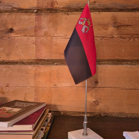 Vanha standaari, kultaisen värisellä lipputangolla, laatta poistettu, korkeus ~47cm