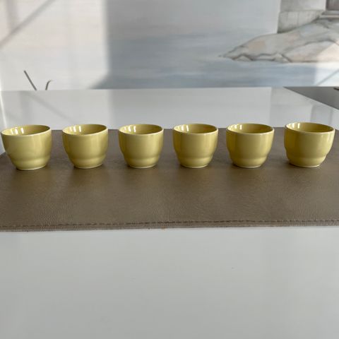 Arabian valmistamat (1953-75) ja Kaj Franckin suunnittelemat siniset Kilta-munakupit. Merkinnät kupin pohjasta ovat kuluneet pois. Korkeus 4 cm, halkaisija 4,7 cm.
