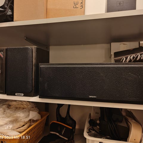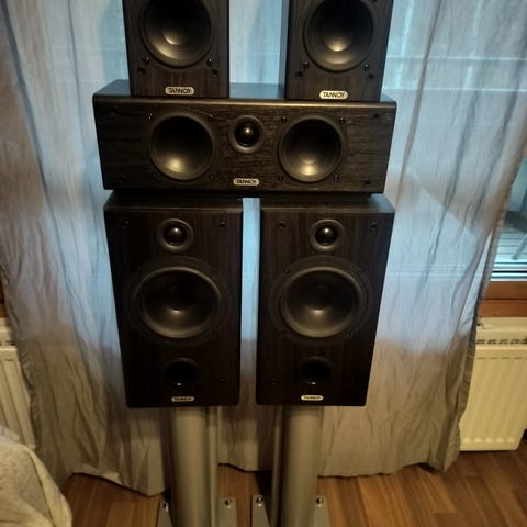 Hyväkuntoinen Tannoy V kaitinsarja. Toisen hyllykaiuttimen kotelo imaissut hieman vettä - ei vaikuta ääneen (kuva).
