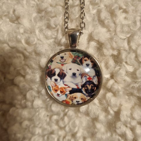 Upea pronssinvärinen kaulakoru, jossa koira ja ihminen ovat yhteisen sateenvarjon alla. 🐕🩷