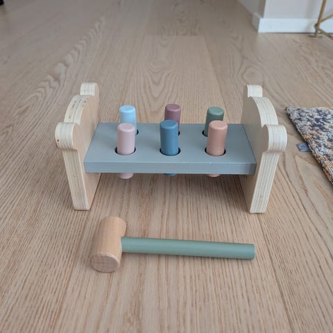 Myydään kuvan vanha Ikean Hakka lelu. Käytön jälkiä löytyy. Runko on puinen. Tapit on muovia. Vasara ei muistaakseni ole alkuperäinen. Vasaran varressa on pieni lohkeama.