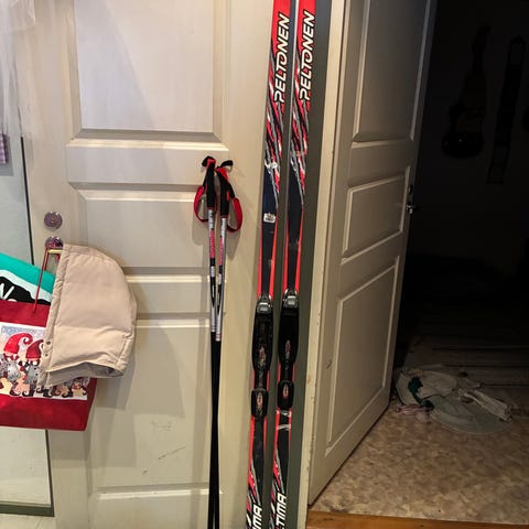 Myydään siisti paketti, sukset 120cm, sauvat 92cm ja monot kokoa 34.