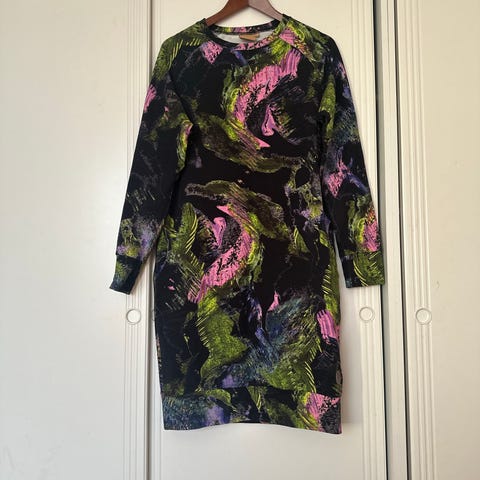 Blaa-merkkinen mekko laskeutuvaa, pehmeää lyocelia. Kieraisumallinen yläosa, levenevät helma. Siististi käytetty kunto.