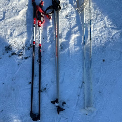 Exel lasten hiihtosauvat 90cm. Vanhat ja käyttö näkyy, mutta käyttökuntoiset kuitenkin. Näissä muoviset piikit ja myös nuo käsiremmit on muovia.