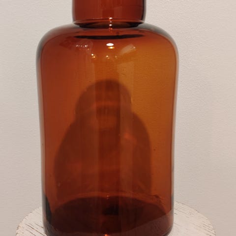 Neljä litteä kirkasta apteekin pulloa. Yhdessä etiketti. Pullojen korkeudet:23, 20, 12 ja 9 cm.