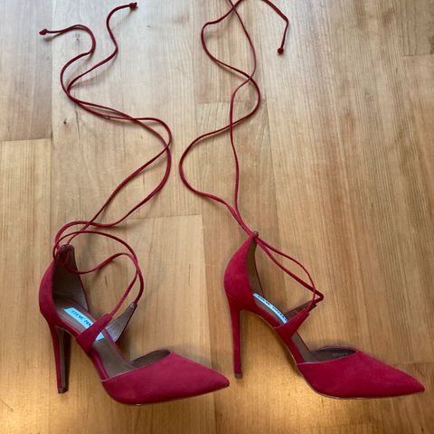 Kerran käytetyt Steve Maddenin aniliininpunaiset kiilakorkokengät. Päälinen mokkanahkaa. Säilytyksessä tullut pienet vaaleat nirhaumat sivuille. Muutoin erinomaisessa kunnossa.