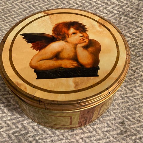 Kuvan pyöreä peltinen rasia. Korkeus 16 cm ja halkaisija 10 cm. Ehja ja siisti.