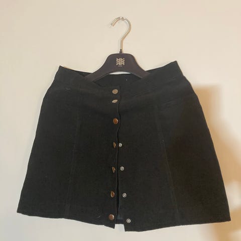 Kaunis musta röyhelö minihame. Kankaassa kauniita punaisia ruusuja ja metalli renkaita. Takana vetoketju ja nappi. Alushame. Kangas on polyesteria, konepestävä. Ei postitusta. Maksu vain käteisellä. Merkki H&M.
