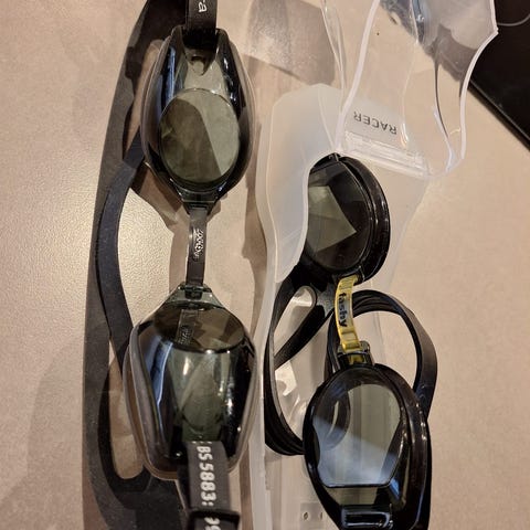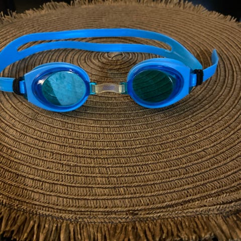Zoggs merkkiset uimalasit. Remmit hieman kellastuneet. Sinisessä linssissä yksi pieni naarmu joka ei haittaa näköä. BS 5883 1996.