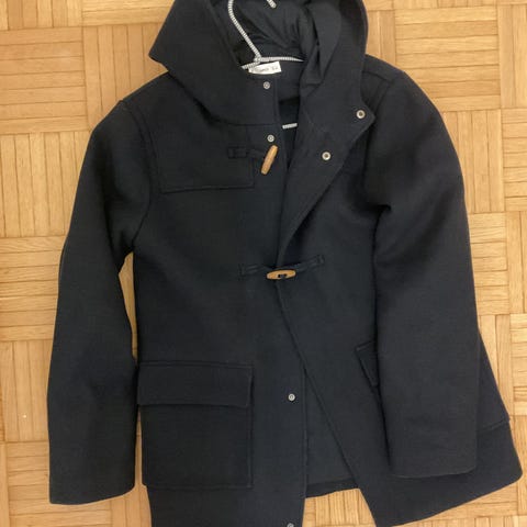 Perinteinen duffelitakki, villakangas, nyötinapit ja vetoketju.