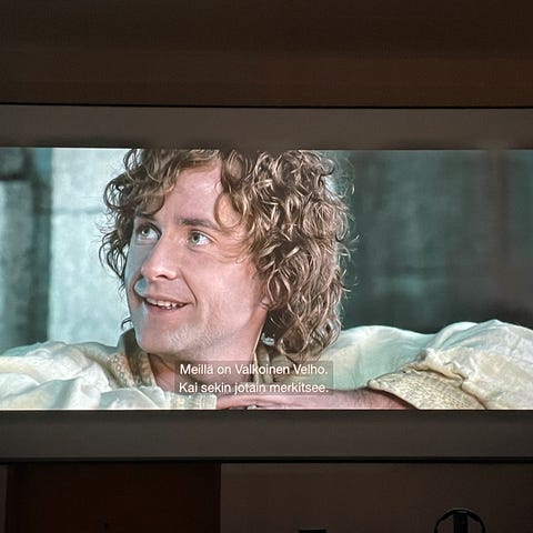 Settiin kuuluu myös laadukas kattokiinnike (Vogels Pro PPC 2540 projektorin kattoteline, hopeanvärinen), viiden metrin virtajohto ja HDMI-kaapeli sekä suuri valkokangas. Valkokangas oli meillä kiinnitetty verhotankoon ja toimi joskus myös verhojen sijasta. Kangas on taitettuna erittäin pitkä, mutta mahtuu vinottain peräkärryyn.