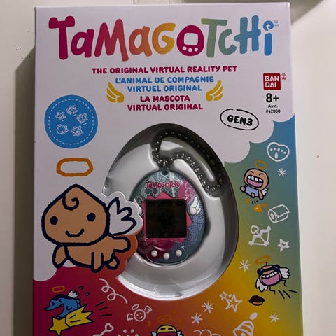 Bandai Tamagotchi digitaalinen lemmikki, vihreä, muovinen kotieläinlaite, jossa on pieni näyttö ja avainketju. Laite toimii paristoilla ja on tarkoitettu viihteelliseksi digitaaliseksi lemmikiksi käyttäjille.