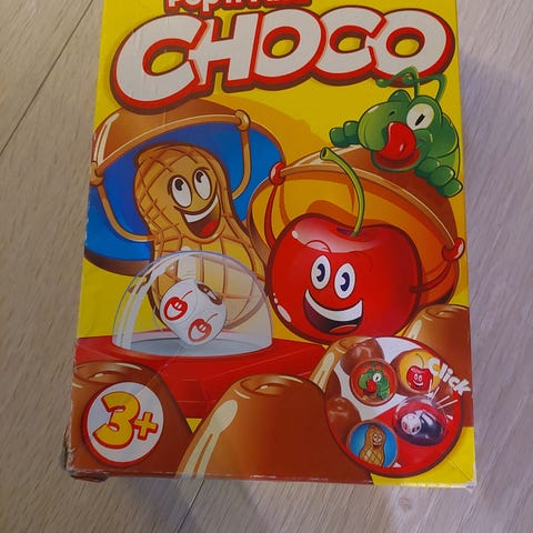 Myynnissä CHOCO-peli, ikäsuositus 3+ . Peli sisältää 16 pelinappulaa ja Pop-O-Matic-nopan. Pelin pakkauslaatikkoa ei ole valitettavasti enää jäljellä.